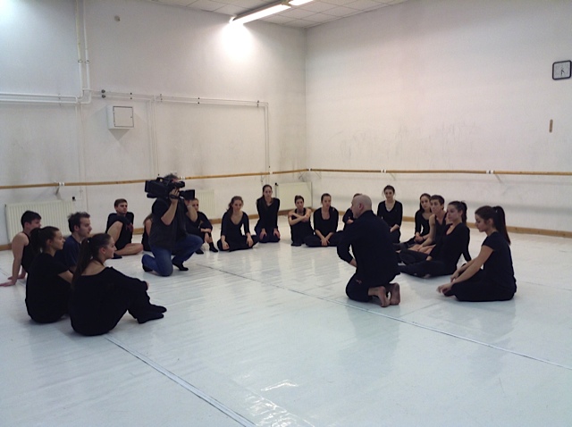 Doug Varone talks with students at the Hungarian Dance Academy after teaching.